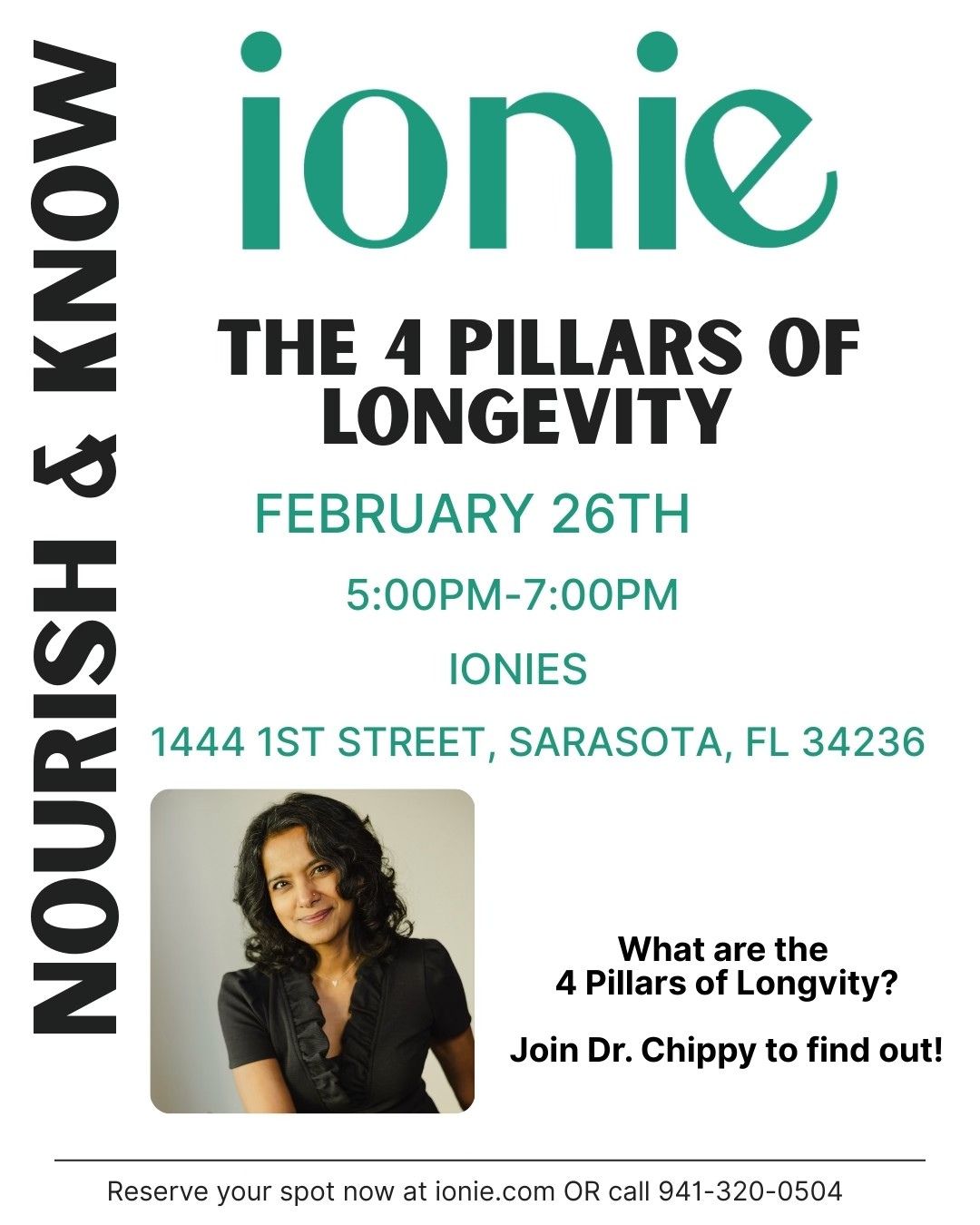 Our next event in the Nourish & Know series is The 4 Pillars of Longevity featuring Dr.Chippy on Thursday, February 26, 2026, at 5:00 pm-7:00pm.